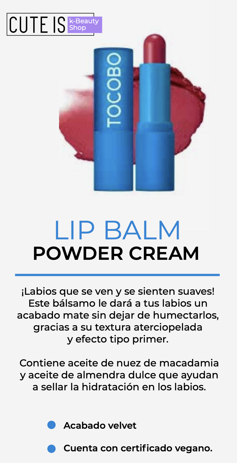 El Lip Balm Powder Cream de Tocobo es un bálsamo labial innovador que combina la suavidad de un bálsamo con el acabado aterciopelado de un polvo. Su fórmula única nutre profundamente los labios, dejándolos suaves, hidratados y protegidos durante todo el día. Gracias a sus ingredientes cuidadosamente seleccionados, este bálsamo ofrece una textura ligera y no pegajosa, mientras que su efecto matificante crea un acabado natural y sedoso. Ideal para labios secos o agrietados, aporta una sensación de confort y frescura con cada aplicación. Perfecto para usar solo o como base antes de aplicar tu labial favorito, el Lip Balm Powder Cream es un must-have para mantener tus labios cuidados y con un aspecto impecable.
