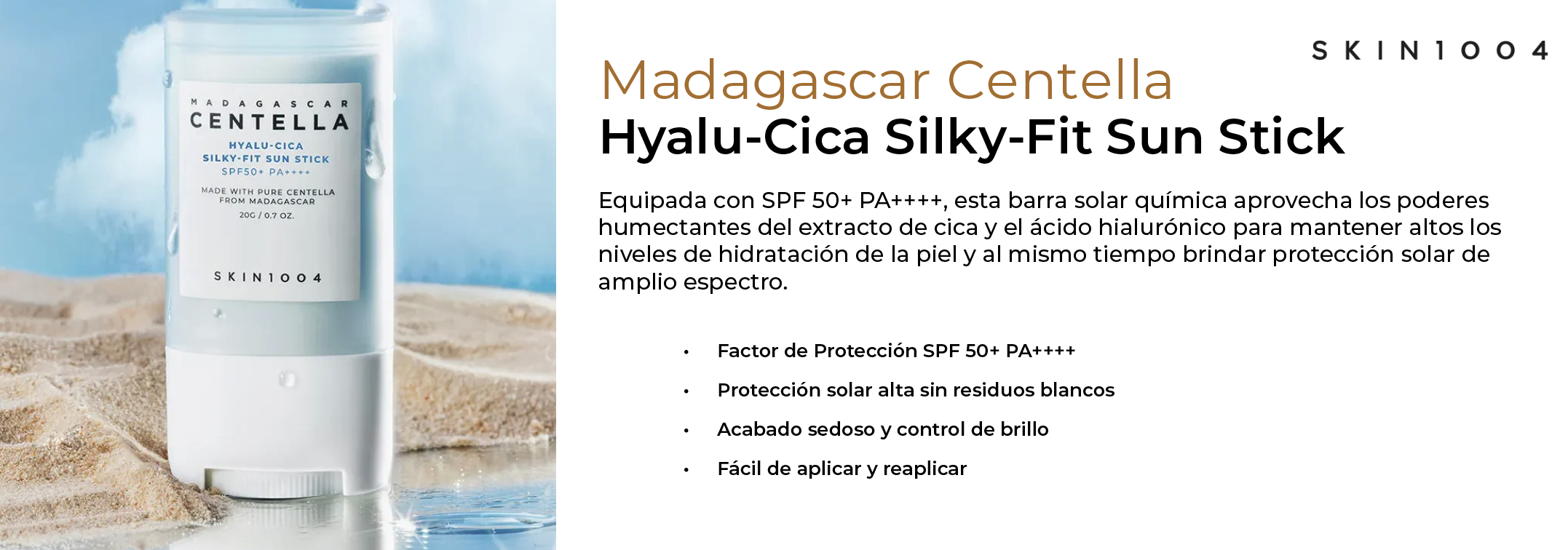 Equipada con SPF 50+ PA++++, esta barra solar química aprovecha los poderes humectantes del extracto de cica y el ácido hialurónico para mantener altos los niveles de hidratación de la piel y al mismo tiempo brindar protección solar de amplio espectro.