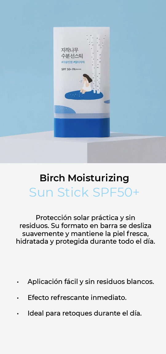 Protección solar práctica y sin residuos. Su formato en barra se desliza suavemente y mantiene la piel fresca, hidratada y protegida durante todo el día.